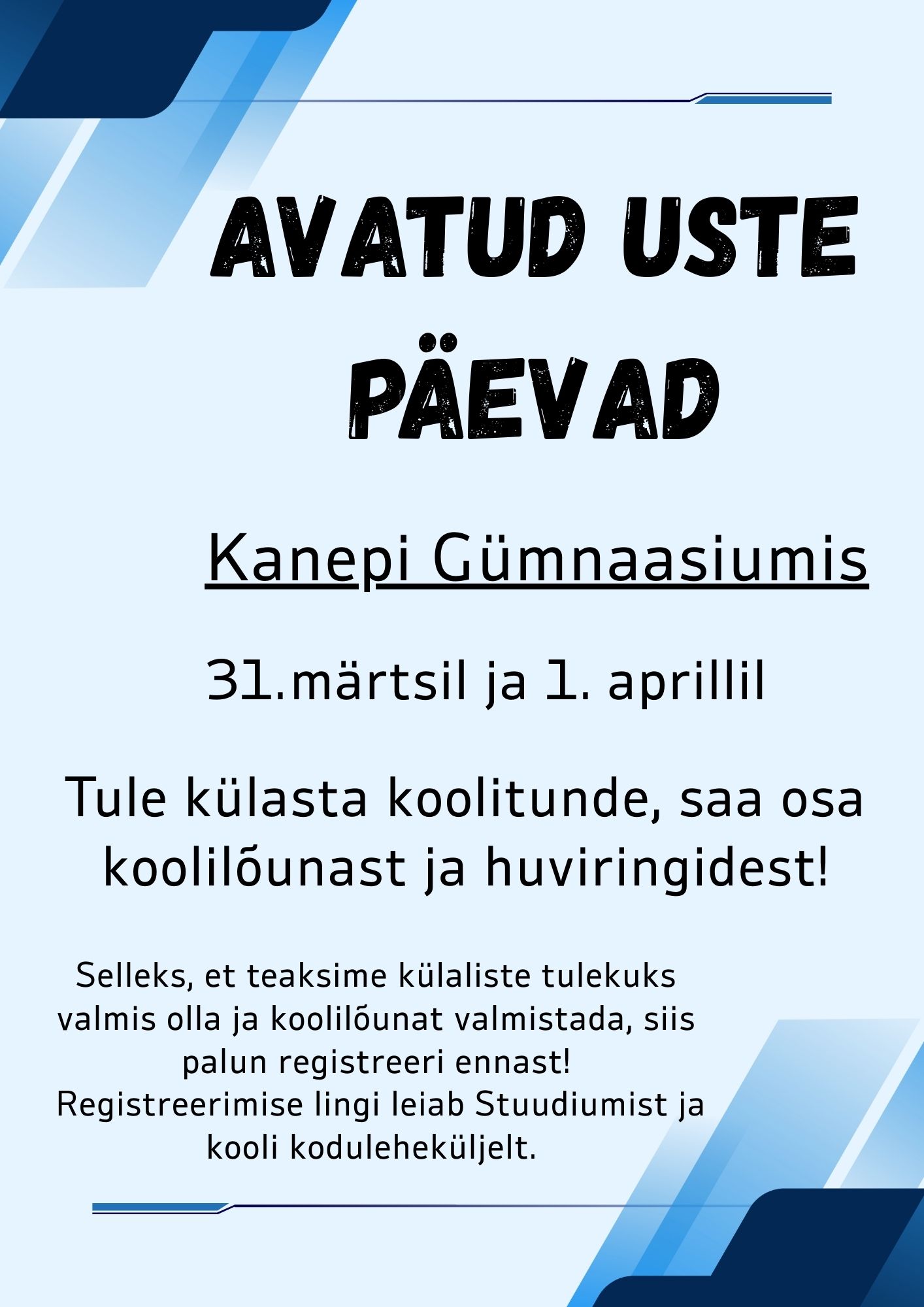 Kui oled mõtlemas õpingute jätkamisele gümnaasiumis ning soovid lähemalt tutvuda Kanepi Gümnaasiumi õppimisvõimaluste, keskkonna ja toredate inimestega, siis oled oodatud meie avatud uste päevadele 31. märtsil ja 1. aprillil 2026.