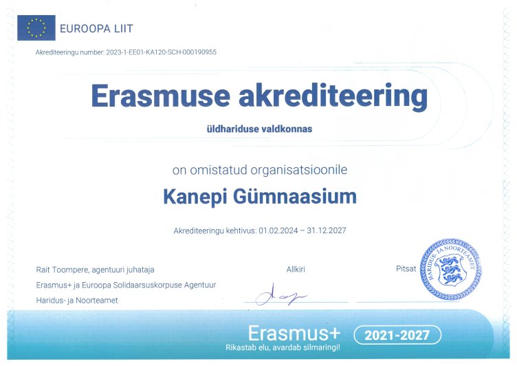 Kanepi Gümnaasium on pälvinud üle-euroopalise kvaliteedimärgise - Erasmuse Euroopa õpirände akrediteeringu aastateks 2024-2027.